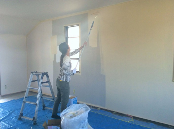 室内は既存のクロスの上からペンキを塗ります。 試し塗りも大胆に。